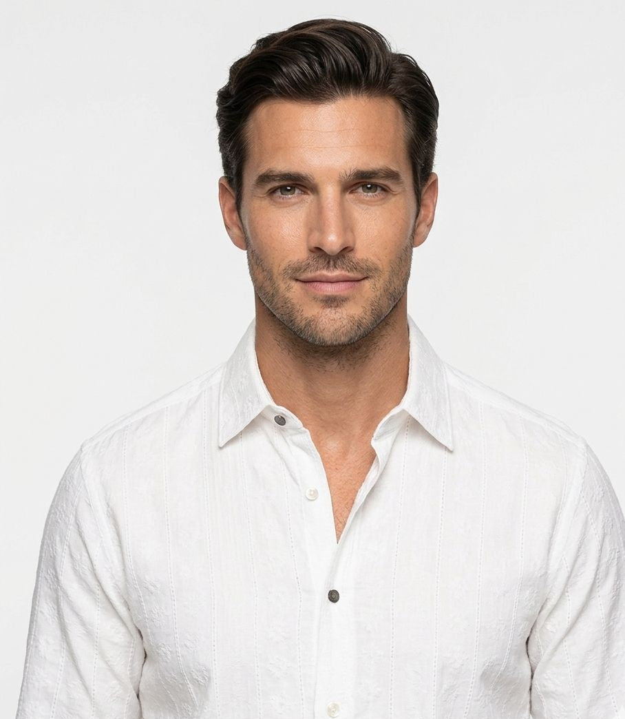Perfecta para eventos de verano, cenas informales elegantes o incluso para elevar un look casual con pantalón chino o denim premium. Su textura aporta diferenciación frente a la clásica camisa lisa, convirtiéndola en una pieza clave de armario para hombres que buscan detalle y personalida